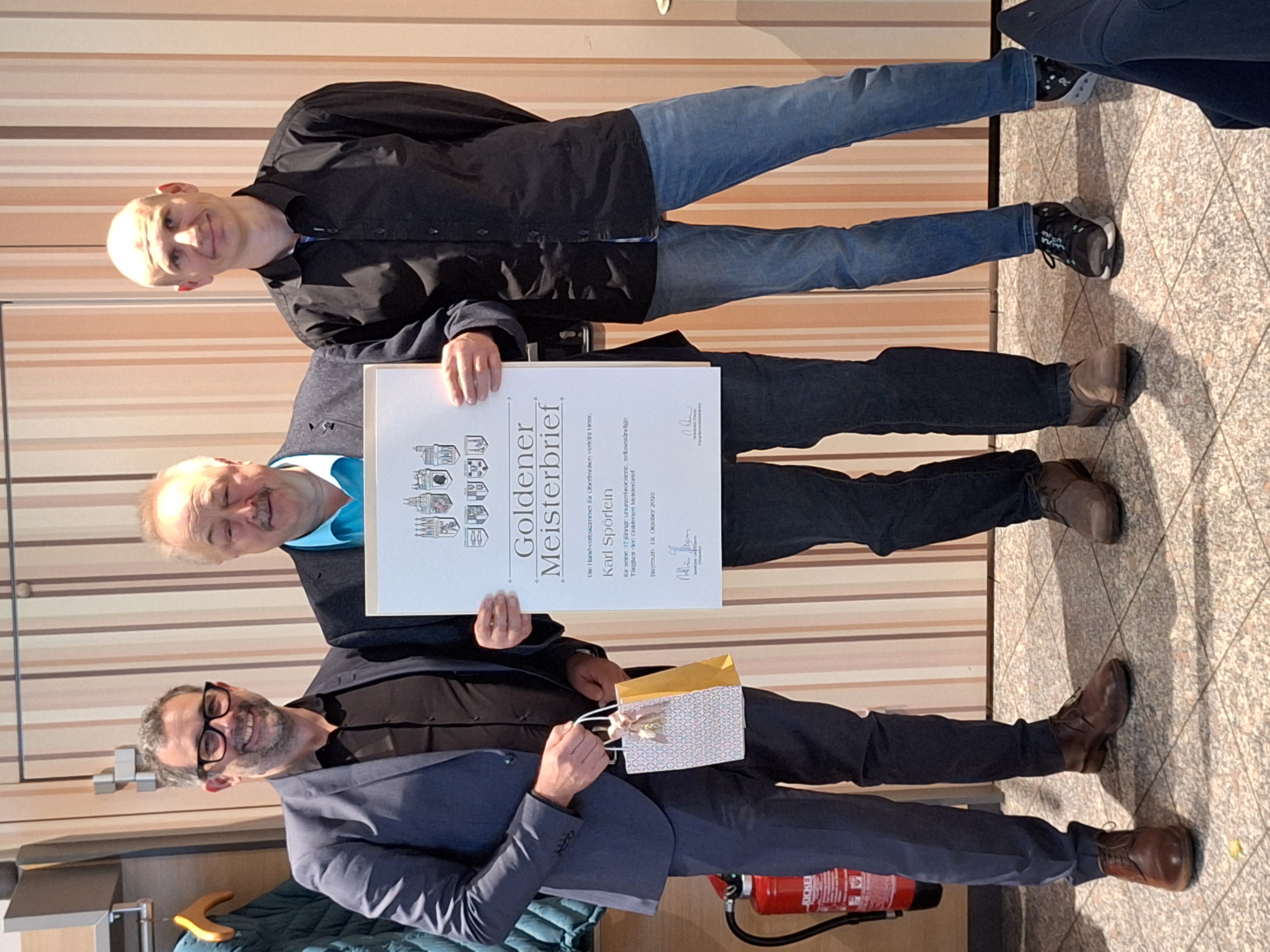 Nach einer sehr bewegenden Rede durch Jochen Geck (ehemaliger Azubi und Wegbegleiter) wurde Parkettlegermeister Karl Spörlein aus Hirschaid der GOLDENE MEISTERBRIEF überreicht.